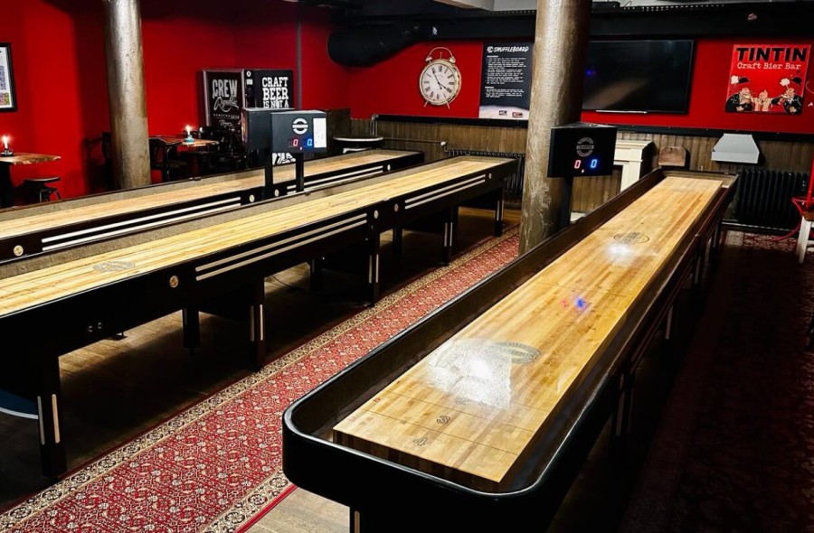 (Shuffleboard är ett socialt brädspel, liknande curling, där spelare skjuter puckar längs ett långt bord för att placera dem i poängzoner längst bort, samtidigt som de försöker blockera eller slå bort motståndarens puckar. Målet är att få poäng genom att landa i de höga poängfälten och vara först till 15 poäng, där endast hela puckar i poängzonerna räknas och puckar som hänger över kanten kan ge extra poäng.)